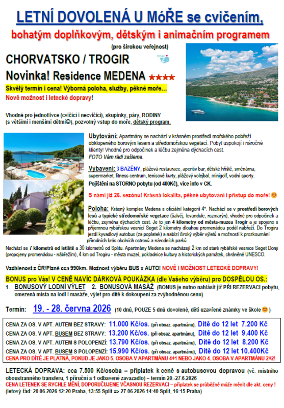 | Cena za osobu autobus, bez stravy, v apartmánu A2+2 2 + 2 osob | 19.06.2026 - 28.06.2026 | 13 200,00 Kč |