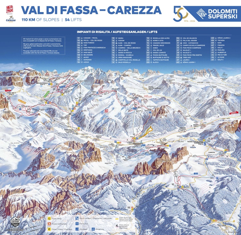 Lyžařské středisko, které má úžasných 131,5 km sjezdovek. Nejvíce sjedzovek má červených. Čeká Vás krásné údolí táhnoucí se jako „prodloužení“ Val di Fiemme až pod nejvyšší horské štíty centrálních Dolomit a pestrá lyžařská nabídka 5 hlavních skiareálů o celkových 131,5 km pist v rámci Val di Fassa e Carezza. Sice méně známé, ale stále poloprázdné a výborné areály Passo Costalunga a Ciampedié a nedaleké nadmíru oblíbené areály Alpe Lusia, Passo San Pellegrino / Falcade a Latemar jako doplněk široké lyžařské nabídky. Také Vás láká unikátní noční lyžování na závodní sjezdovce Aloch v Pozza di Fassa a vysokokapacitní přepravní zařízení, v průměru velice moderní.